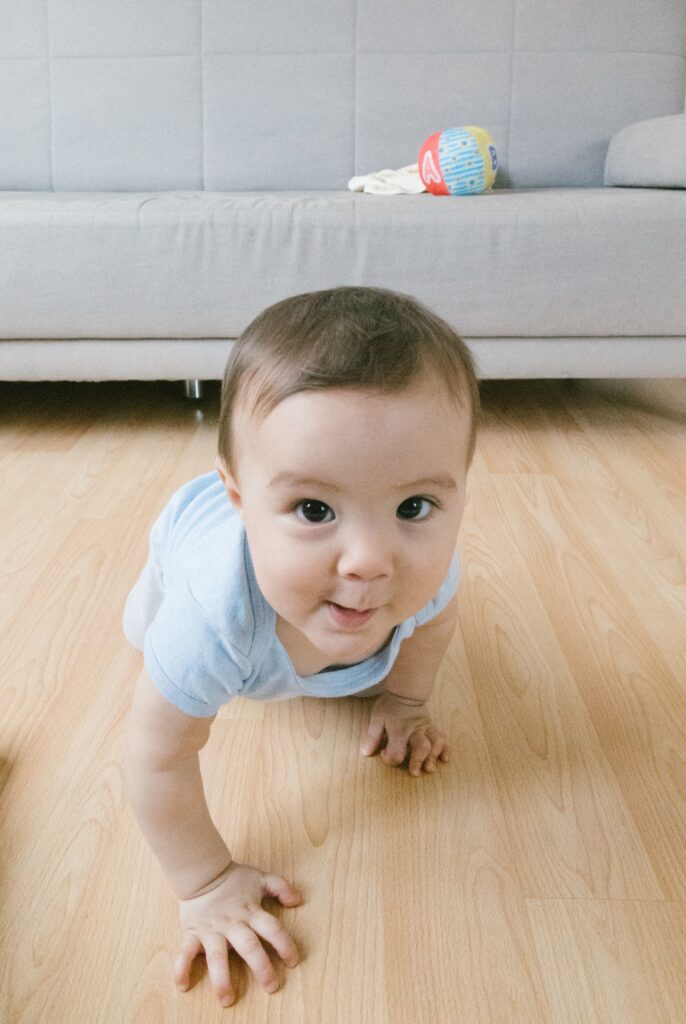 Some babies will bear crawl, where the legs are kept straight. This often happens when the baby is avoiding hard floors! As long as you’re seeing lots of variety of movement patterns during play, this isn’t concerning.